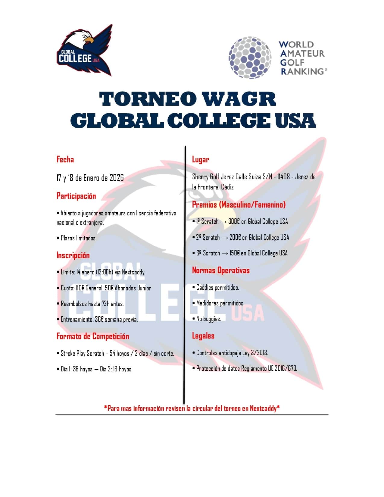 La inscripción a uno o varios torneos a la vez, según se habilite, se tendrá que realizar a través de la plataforma de gestión de torneos de la Federación Andaluza de Golf Nextcaddy u otra plataforma que el Club designe. Alternativamente, los jugadores podrán solicitar la inscripción en el teléfono +34 956 088 330, por correo electrónico a info@sherrygolf.com o rellenando el formulario online en www.sherrygolf.com/competiciones. El jugador deberá indicar el nombre y apellidos, número de teléfono y licencia de golf así como la prueba en la que desee participar.